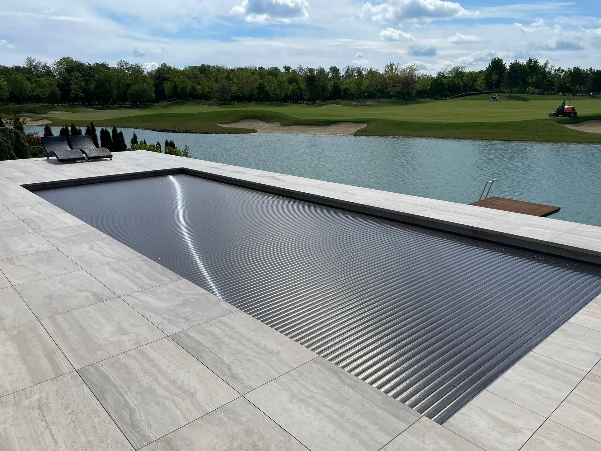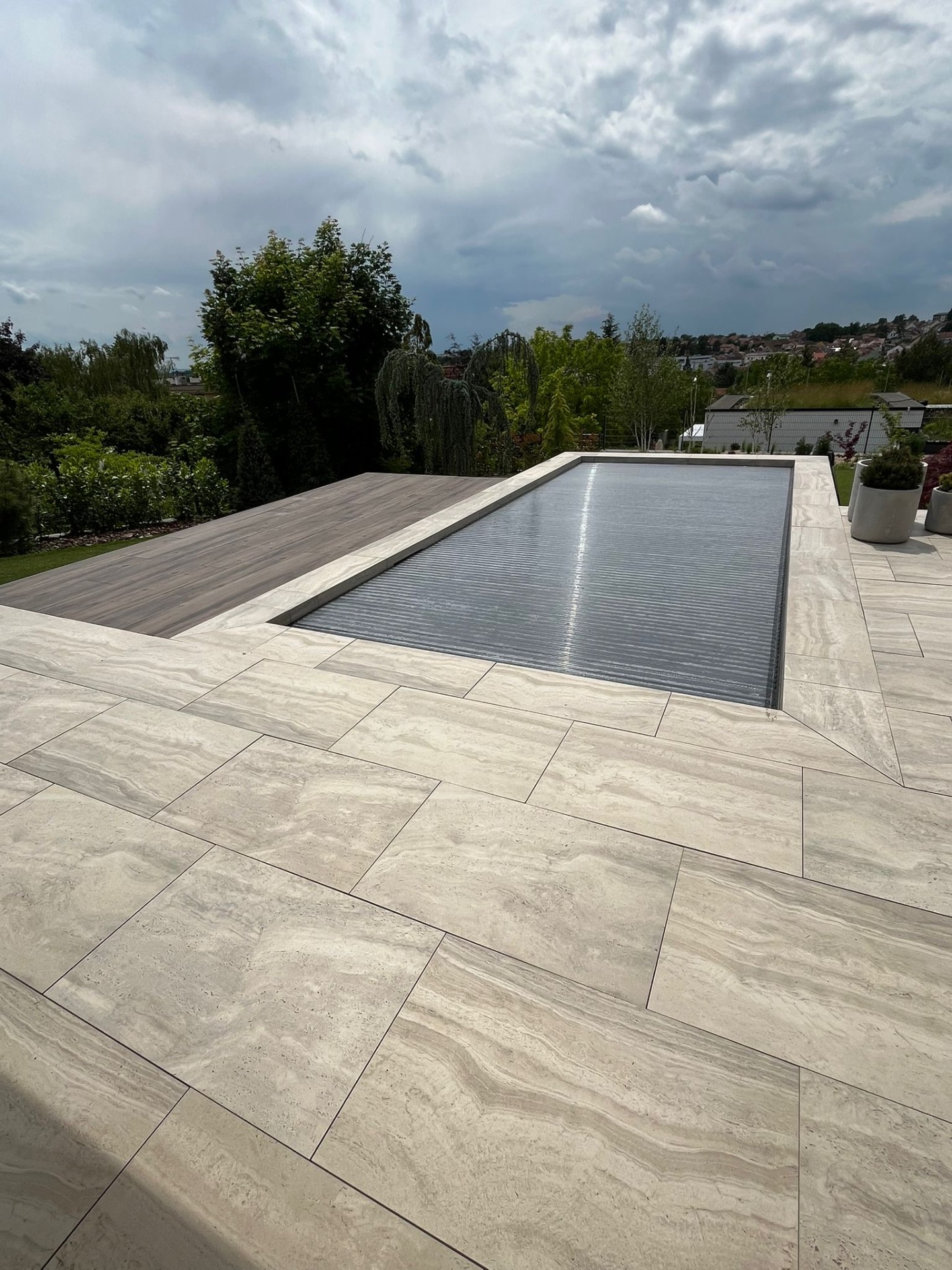 Kaskádový lem vytváří jedinečný efekt, kdy dlažba plynule přechází až k hladině. Tím působí okolí bazénu jako jeden elegantní celek.